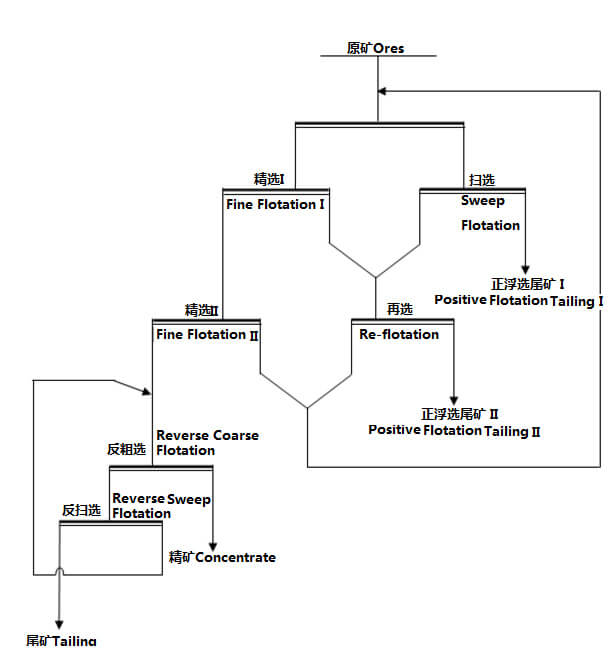 Double reverse flotation is to separate target minerals by anionic collector with positive charge on silicate surface under alkaline conditions. That is, dolomite is first flotated, then silicate is reverse flotation. The product in the tank is heavy concentrate. The production line can be carried out at room temperature and with coarse grain size.